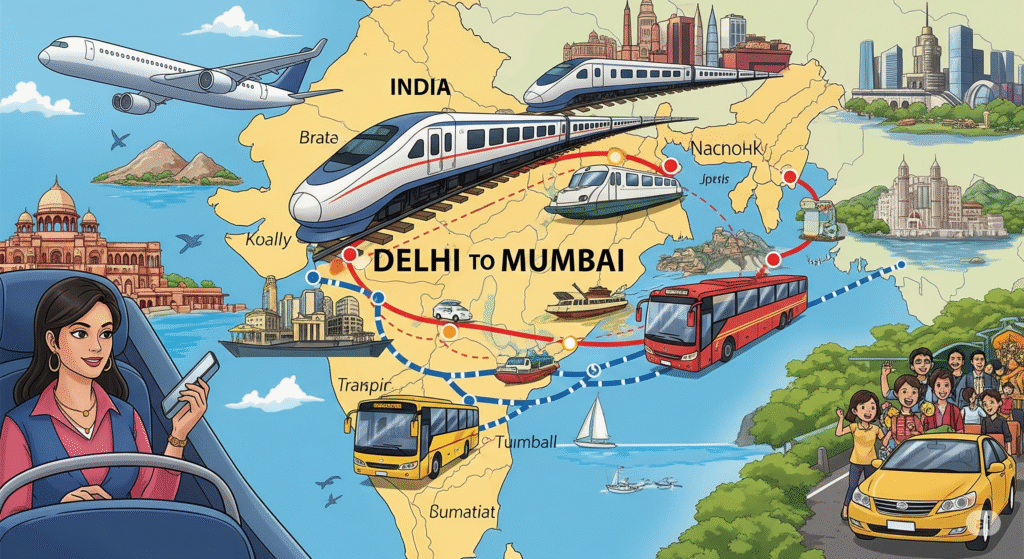 - Fastest Route: Delhi – Jaipur – Udaipur – Ahmedabad – Mumbai (NH48) (~1,400 km).